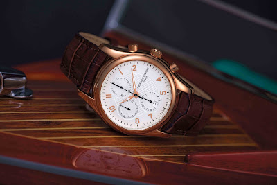 > am Genfersee, Schweiz. Dieser herausragende Zeitmesser mit seinem klassischen, aber zeitgemäßen Design ist nach den Codes der Marke gefertigt und zeichnet sich durch sorgfältige Verarbeitung und Details aus. Das abgerundete Gehäuse mit einem Durchmesser von 43 mm ist in Stahl oder in Roségold plattiert. Es ist handpoliert und zeigt ein fein verziertes Zifferblatt mit guillochiertem Dekor "Pavé de Paris". Die aufgebrachten und polierten Indizes, die dem verwendeten Material entsprechen, garantieren eine gute Lesbarkeit. Als delikater Hinweis auf das maritime Thema ist ein Bootspropeller auf dem Gehäuseboden eingraviert und ein "Bullauge" bietet einen Blick auf die Bewegung. Um den besonderen Wert dieser Uhr hervorzuheben, wird sie in einer Geschenkbox geliefert, die ein Miniaturduplikat einer legendären "Runabout" Yacht bietet. MODELL DETAILS: